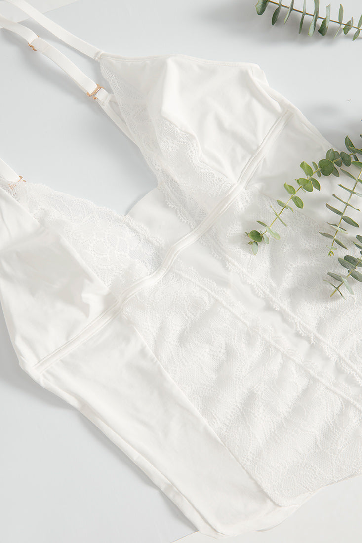 Body brasilero con escote triangular en encaje, elaborado en microfibra y detalle en tul con cargaderas ajustables. Color off white, Ref. 1674O42