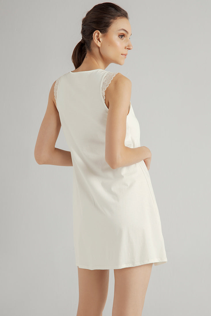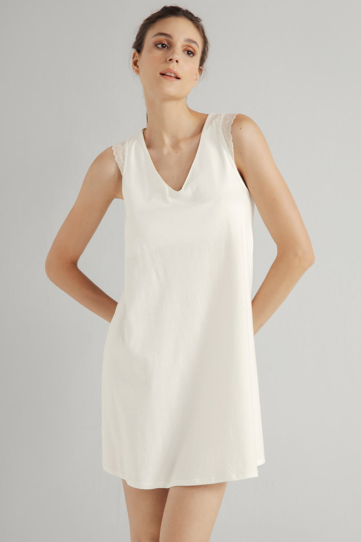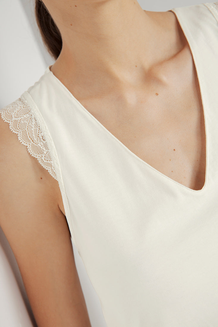 Batola corta elaborada en algodón pima, sin mangas, con encaje, cuello en v y top interno. Color off white, Ref. 1573042