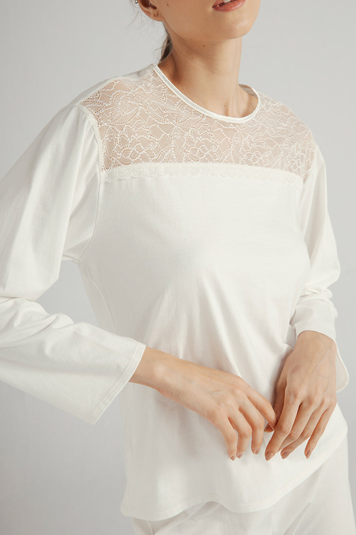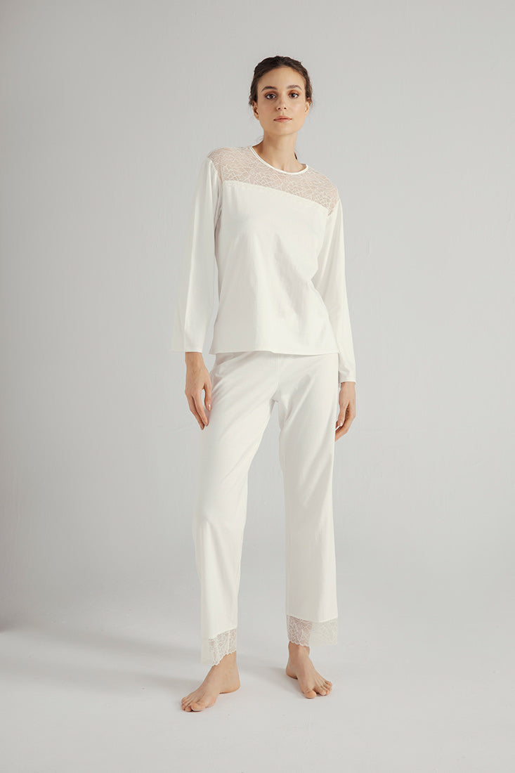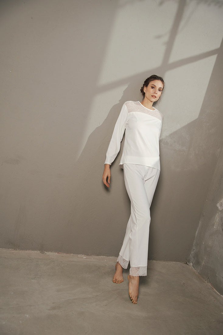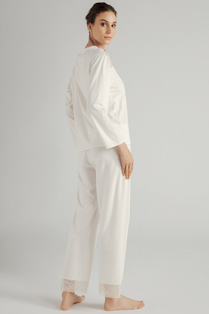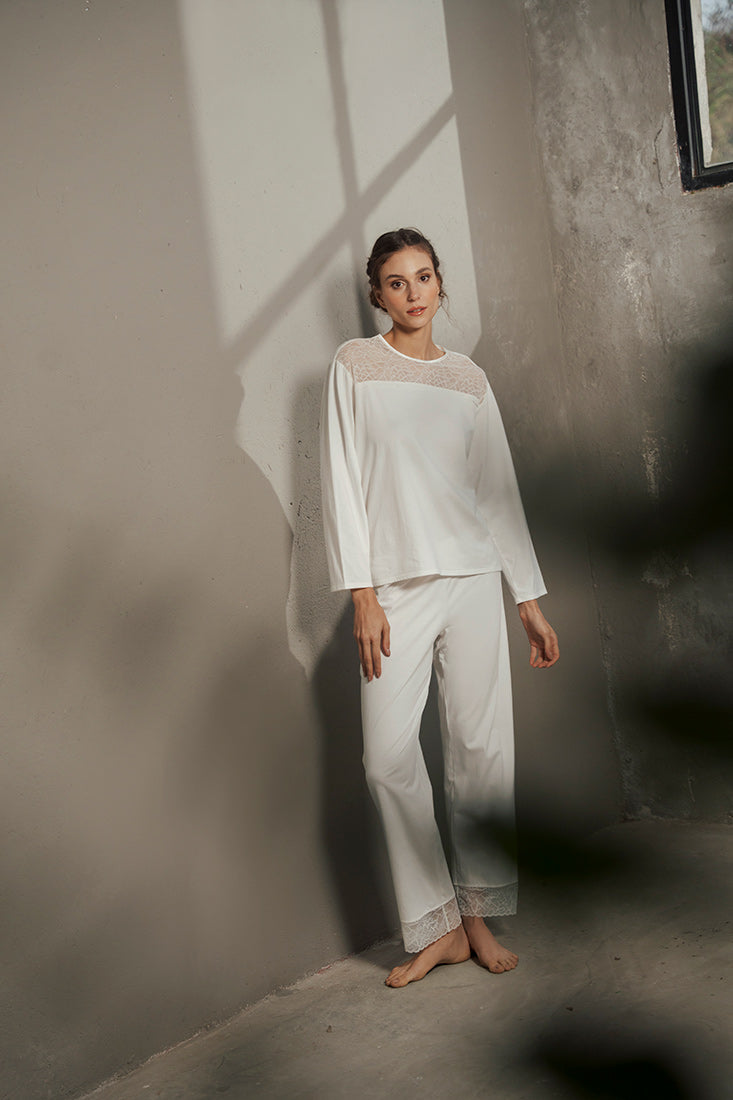 Pijama pantalón elaborada en algodón pima. Camiseta manga larga, cuello redondo y encaje en escote. Pantalón largo bota recta. Color off white, Ref. 1574042