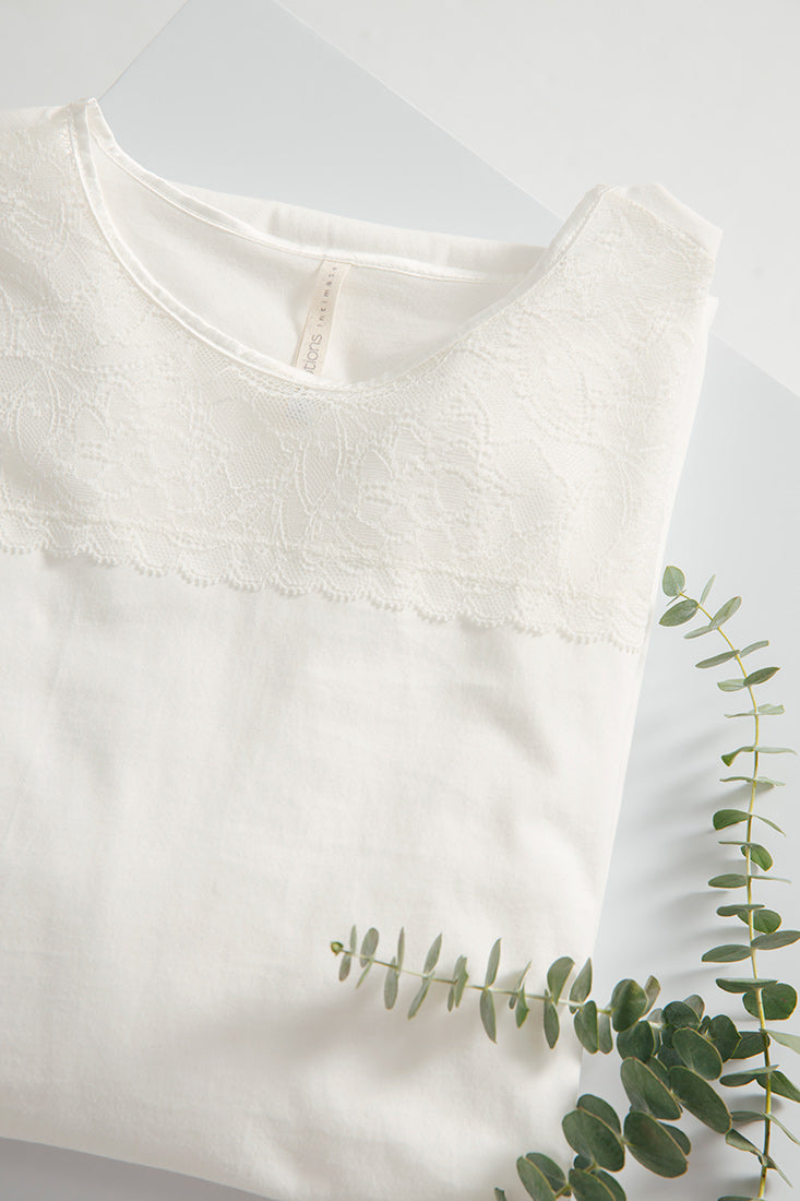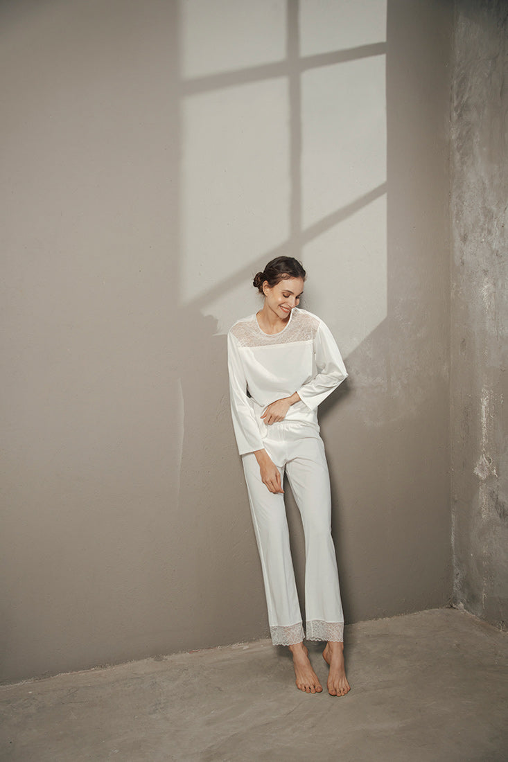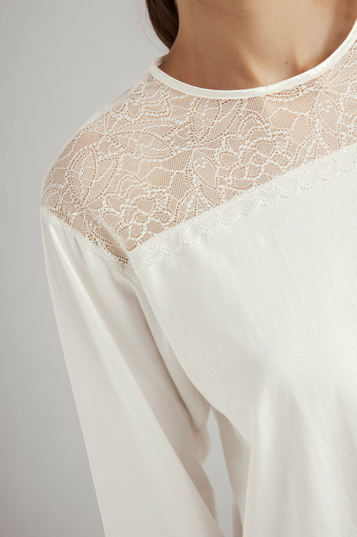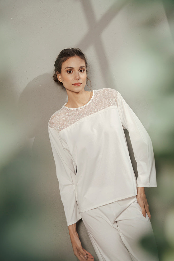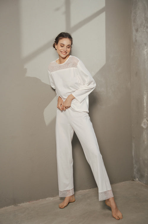 Pijama pantalón elaborada en algodón pima. Camiseta manga larga, cuello redondo y encaje en escote. Pantalón largo bota recta. Color off white, Ref. 1574042