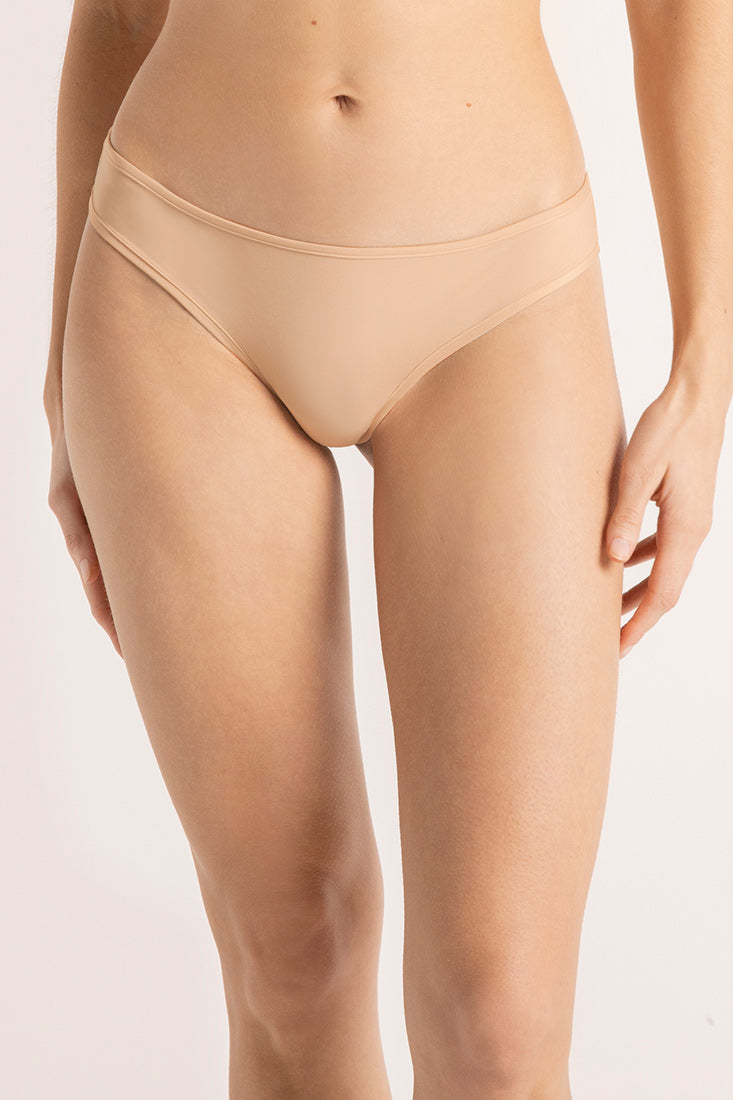 Brasilera básica en lycra con sesgo de la misma tela en cintura y pierna. Viene en color off white, negro o piel, Ref. 1198P91
